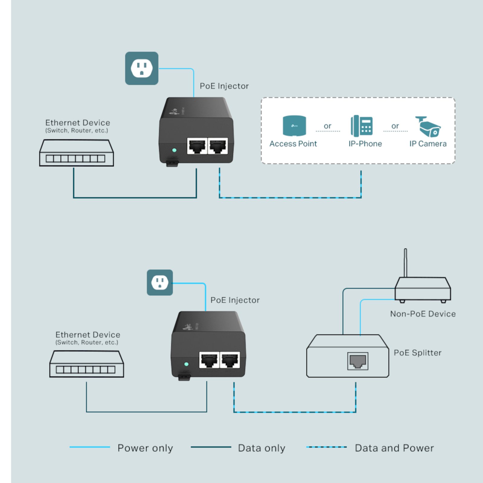 El inyector PoE+ TL-POE160S cumple totalmente con los estándares IEEE 802.3af/at y puede funcionar con todos los PD (dispositivos alimentados) o adaptadores receptores PoE compatibles con IEEE 802.3af/at PoE, como el TL-POE10R de TP-Link u otro equivalente. producto, para expandir su red a donde no hay línea eléctrica o toma de corriente, donde desea reparar dispositivos como AP, cámara IP o teléfono IP, etc.