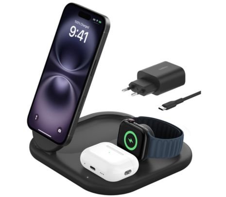 Suministra 15W de carga inalámbrica rápida a tu iPhone 15, 14, 13 o 12, además de 5W a un Apple Watch y 5W a unos AirPods