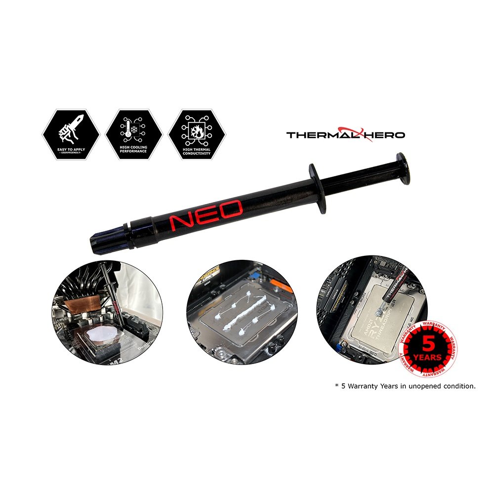 Facilidad de Aplicación: Gracias a su formulación a base de silicona, la pasta térmica Thermal Hero NEO es fácil de aplicar sin problemas de pegajosidad ni excesiva expansión. Esto facilita el proceso de aplicación, garantizando una cobertura uniforme para un rendimiento térmico óptimo.