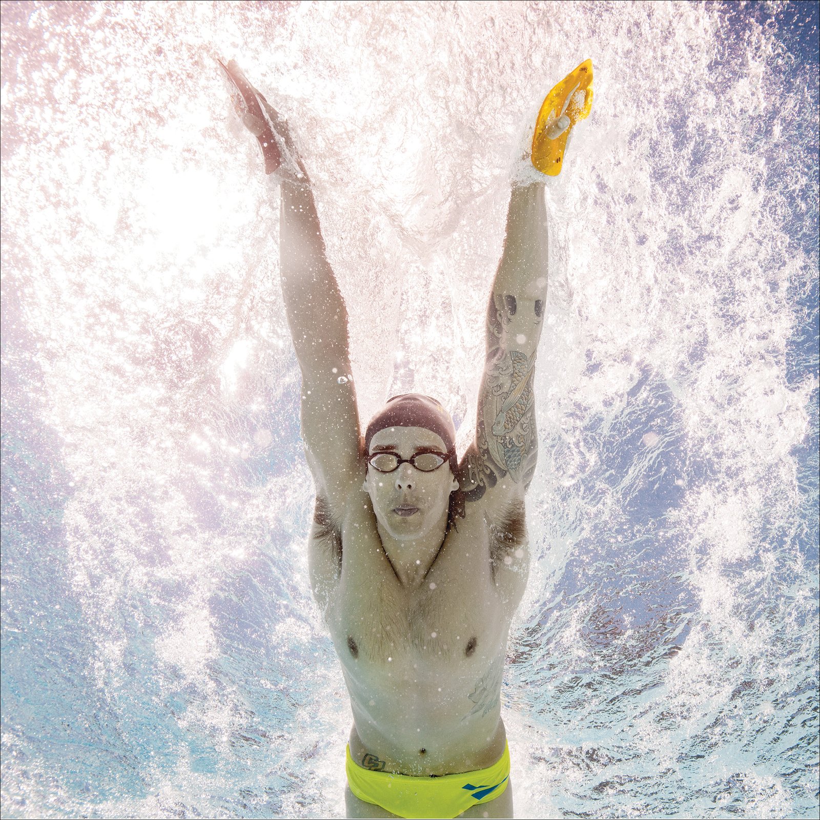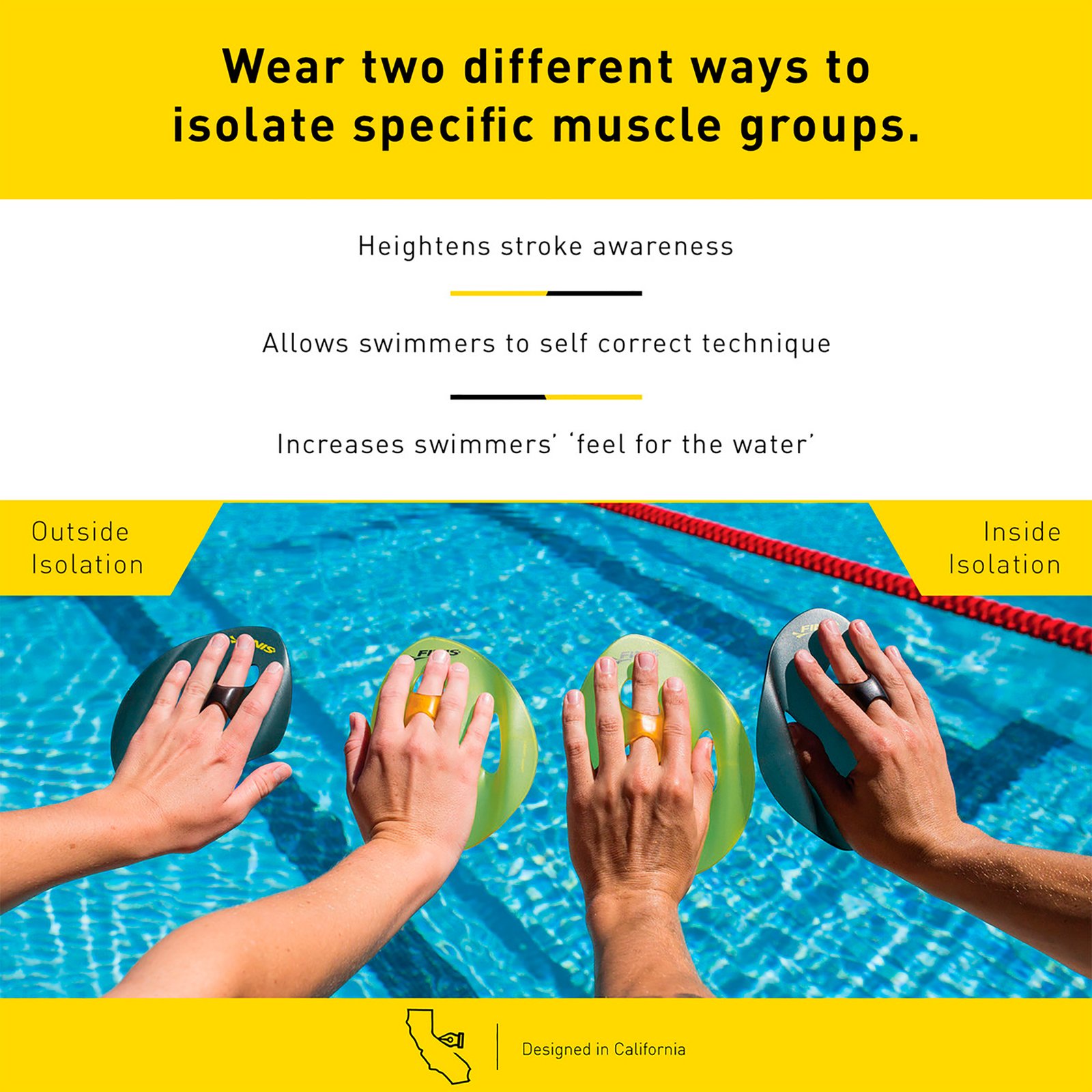 AISLAMIENTO INTERIOR: Usando el borde en el interior (amarilloa la izquierda, negro a la derecha) permite a los nadadores aislar y ejercitar pectoral y músculos bíceps y deltoides.
