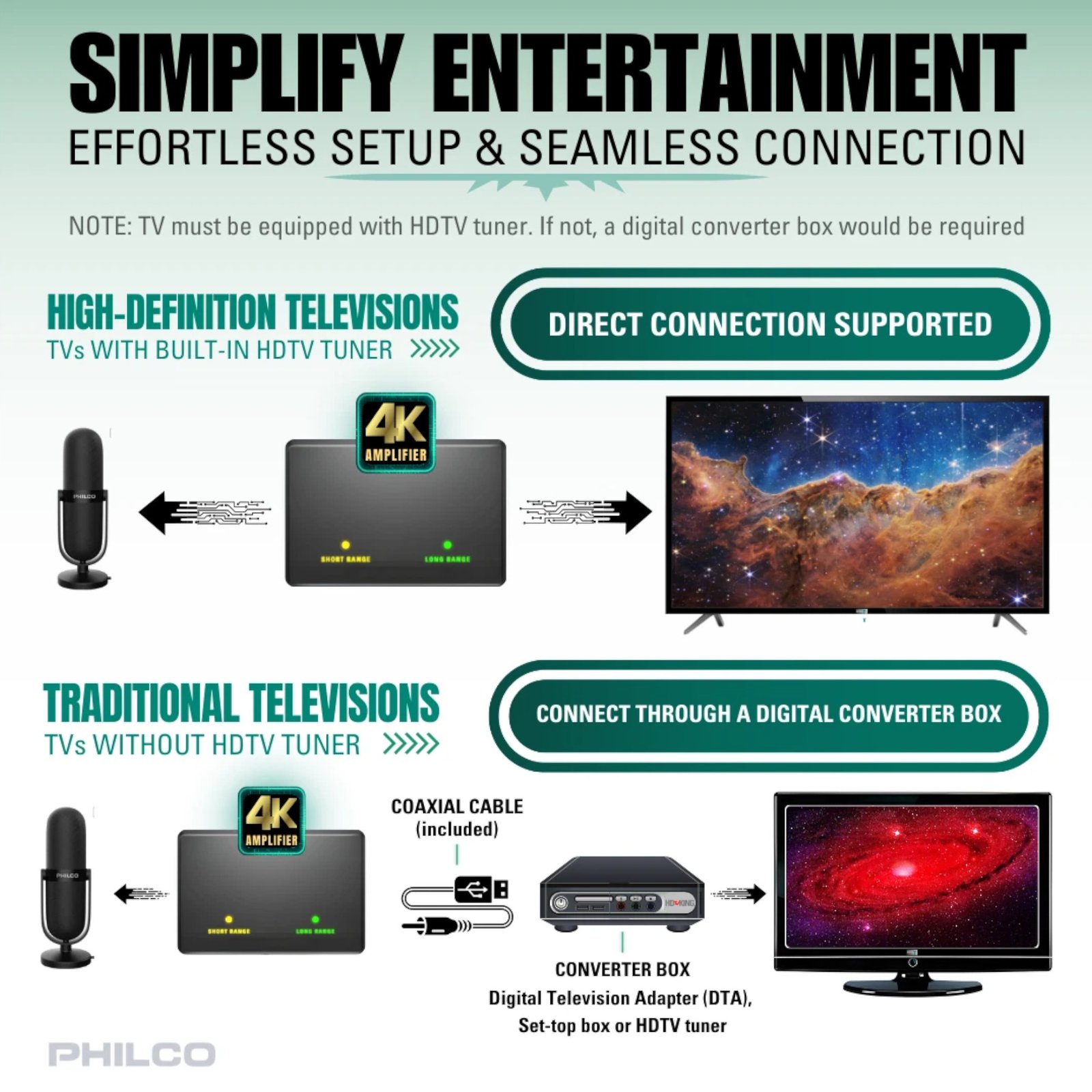 PHILCO – ANTENA DIGITAL PARA TV. PTV3304A. FILTRO 4G/LTE. AMPLIFICADOR INCORPORADO. PARA INTERIOR O EXTERIOR. COLOR NEGRO.