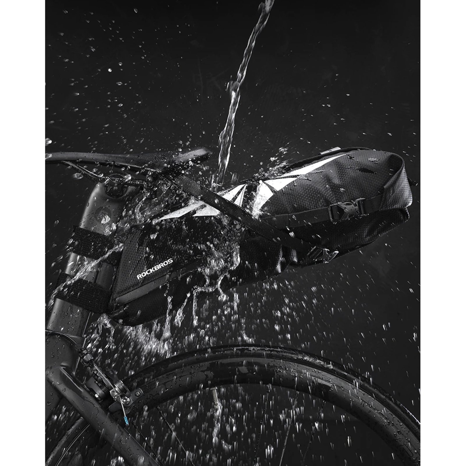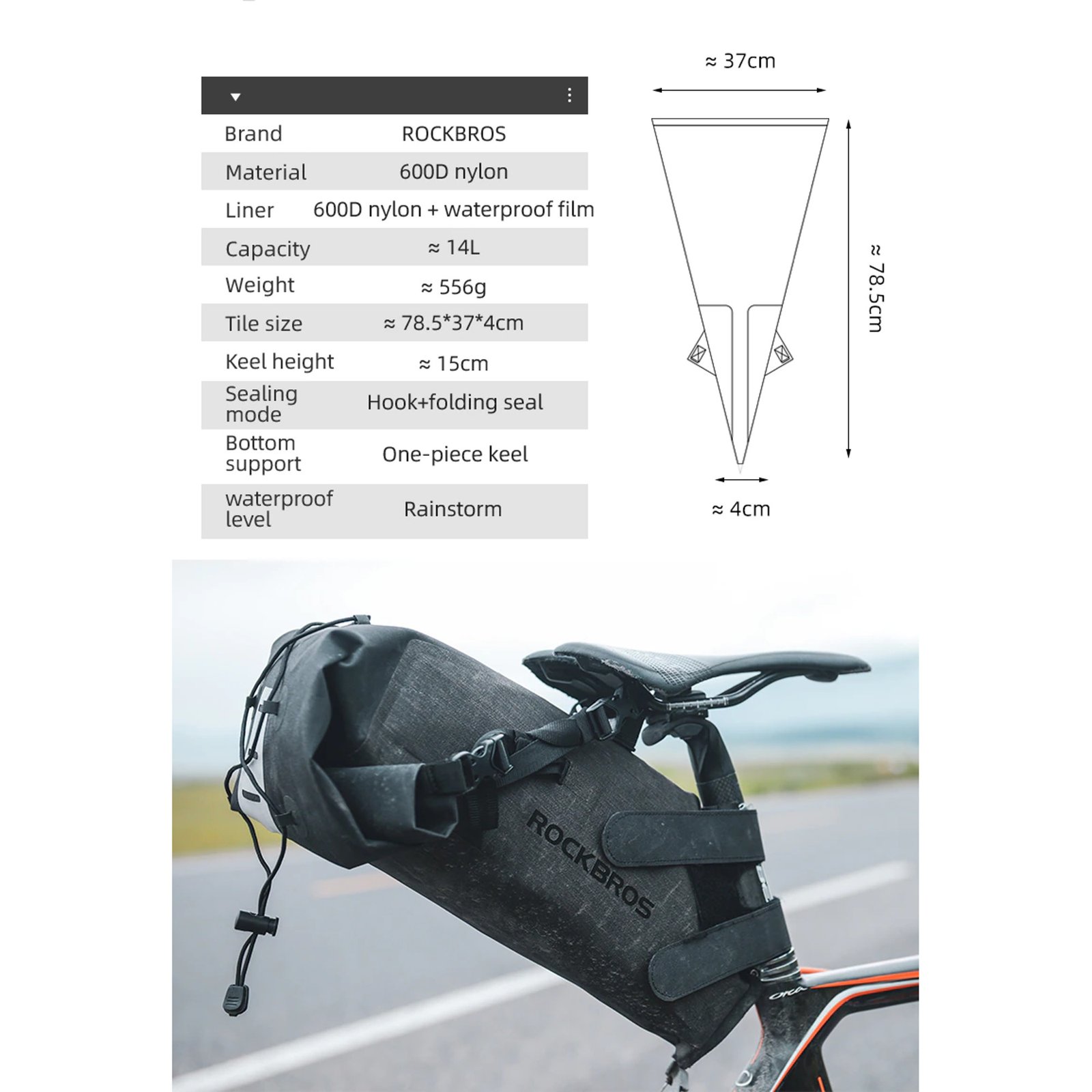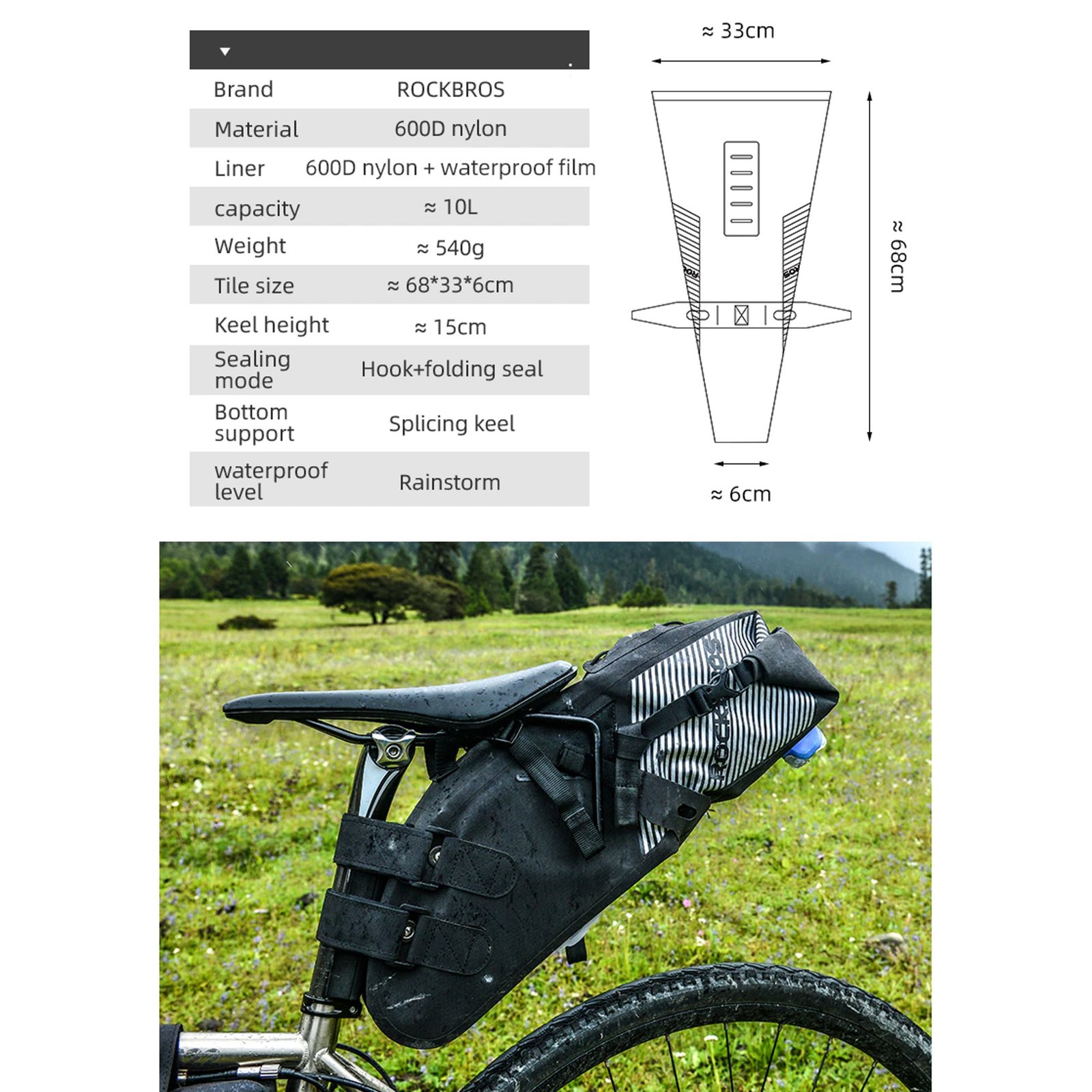 BOLSO PLEGABLE PARA ABAJO DEL ASIENTO DE BICICLETA ROCKBROS. CAPACIDAD 10L. 2 ESTILOS DE ARMADO. PESO ESTILO 1: 540G. PESO ESTILO 2 : 556G. MATERIAL NYLON + REVESTIMIENTO IMPERMEABLE DE TPU.
