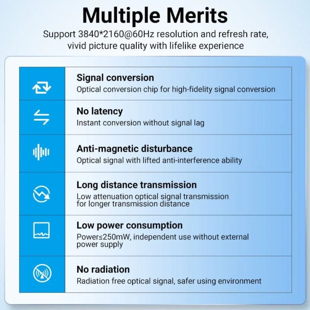 Tecnología de fibra óptica en el núcleo, permitiendo transmisión de señal prácticamente sin atenuación, incluso a distancias largas (hasta 100 m en algunos modelos).