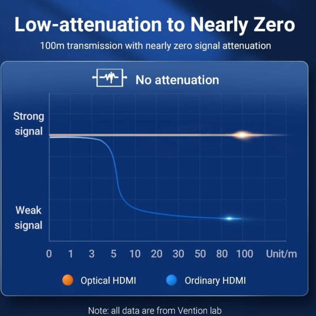 Tecnología de fibra óptica en el núcleo, permitiendo transmisión de señal prácticamente sin atenuación, incluso a distancias largas (hasta 100 m en algunos modelos).