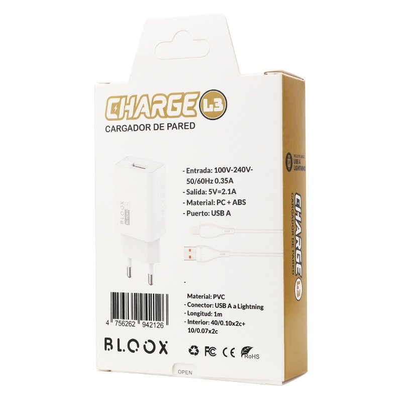 Cargador BLOOX 1 USB 2.1A + Cable Lightning 1M (BL-TCA-L3)