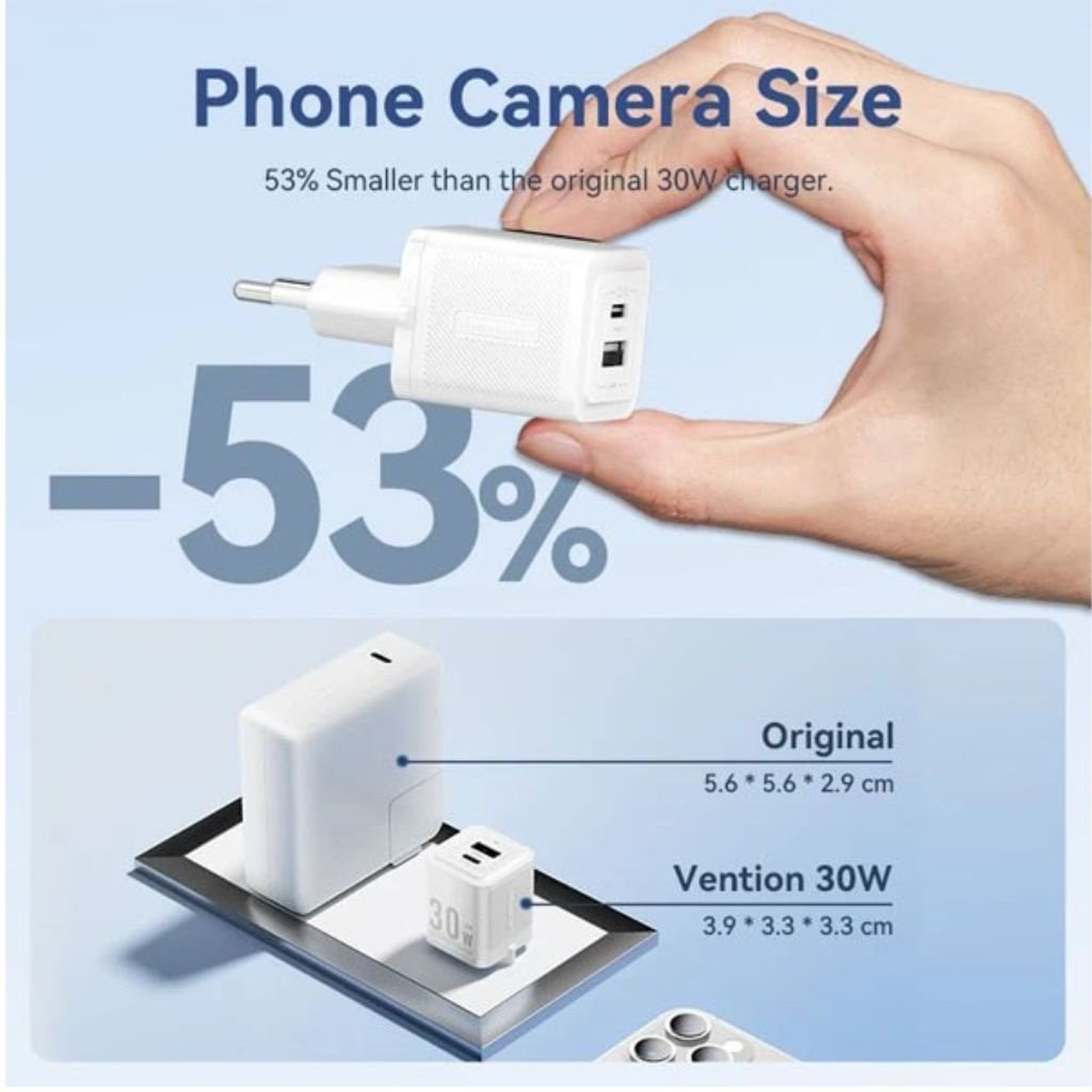 Cargador de Pared USB-A+USB-C GaN USB-C a USB-C 30W/30W / Blanco TZ-FEQW0-EU-01 Vention