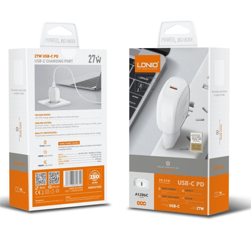 Cargador Pared A1206C USB C a USB C 27W PD Carga Rápida Blanco LDNIO