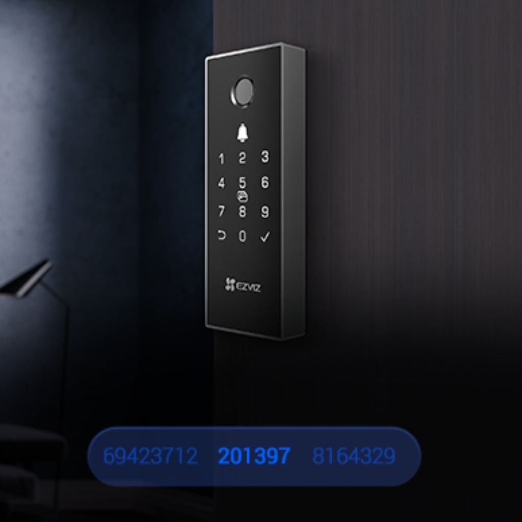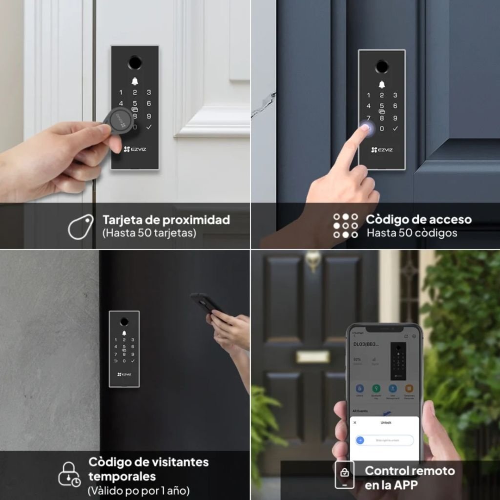 - Abre la puerta de distintas formas cómodas y seguras: mediante código PIN (hasta 50 grupos), códigos temporales para visitantes (validos hasta 1 año) y desbloqueo remoto vía app EZVIZ.