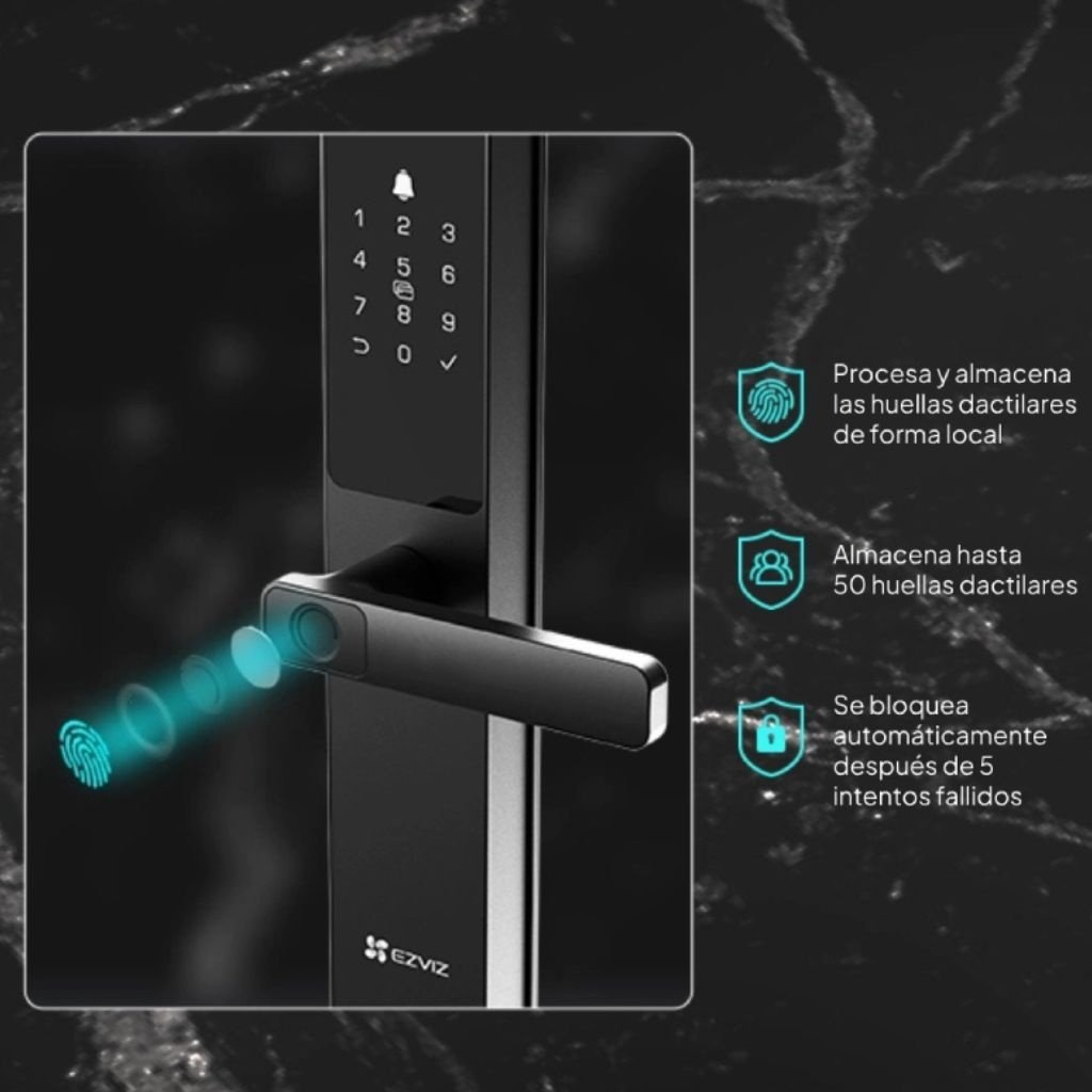 Múltiples métodos de desbloqueo: huella digital, código de acceso, tarjeta de proximidad, llave mecánica, llave bluetooth a través de la aplicación EZVIZ
