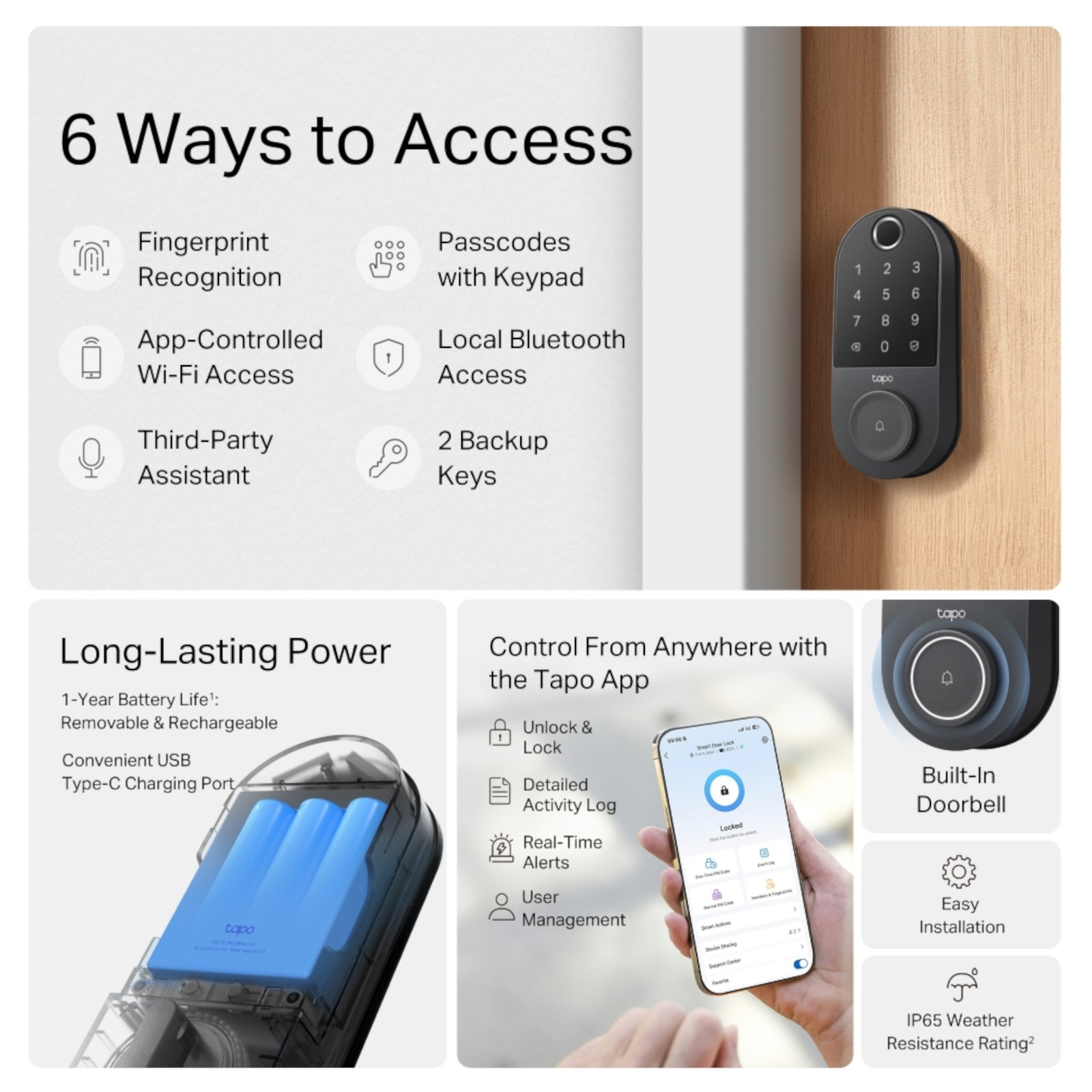 Desbloquee con la aplicación Tapo, mediante huella digital, Bluetooth, teclado, Asistente inteligente o con llaves de respaldo incluidas.