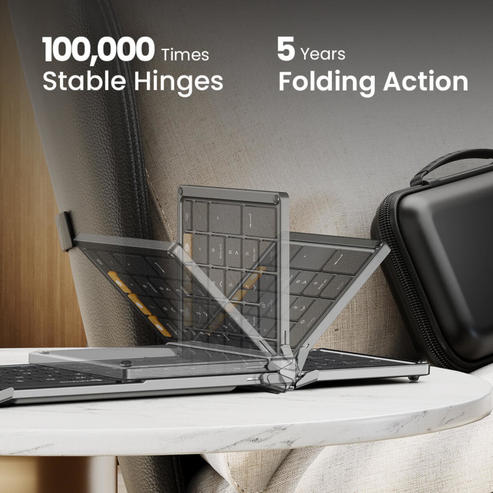 El teclado tiene un diseño de tres pliegues, y es lo suficientemente compacto para transportarlo fácilmente. No te dejes engañar por su pequeño tamaño, ya que cuenta con todas las funciones de un teclado de tamaño normal.