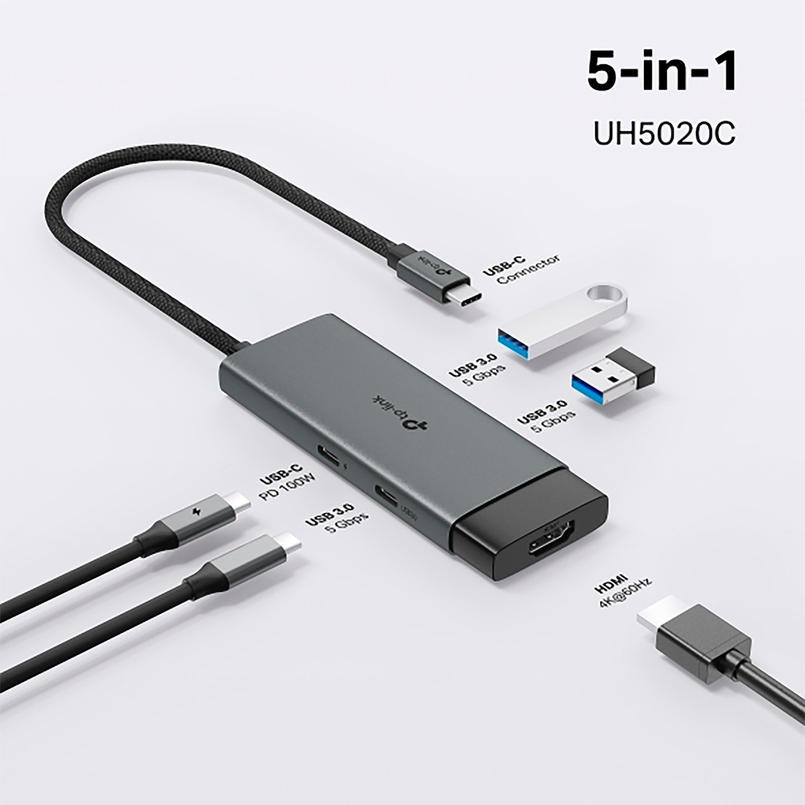 TP-LINK – HUB USB C 5 EN 1 UH5020C – HDMI x1, PD x1, USB C x1, USB A x2.