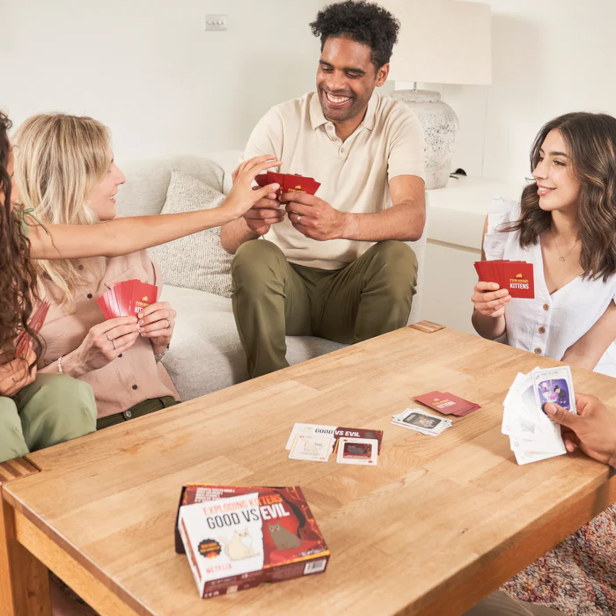 Exploding Kittens Good vs Evil es una versión altamente estratégica de la ruleta rusa, y además mejorada con gatitos explosivos. Los jugadores roban cartas hasta que alguno roba un Exploding Kitten, momento en el que explota y quedas fuera de la partida, a no ser que desactives al Exploding Kitten con una pistola láser, o un suéter de hierba gatera, o que uses poderosas cartas para que el Exploding Kitten le llegue a otro jugador.