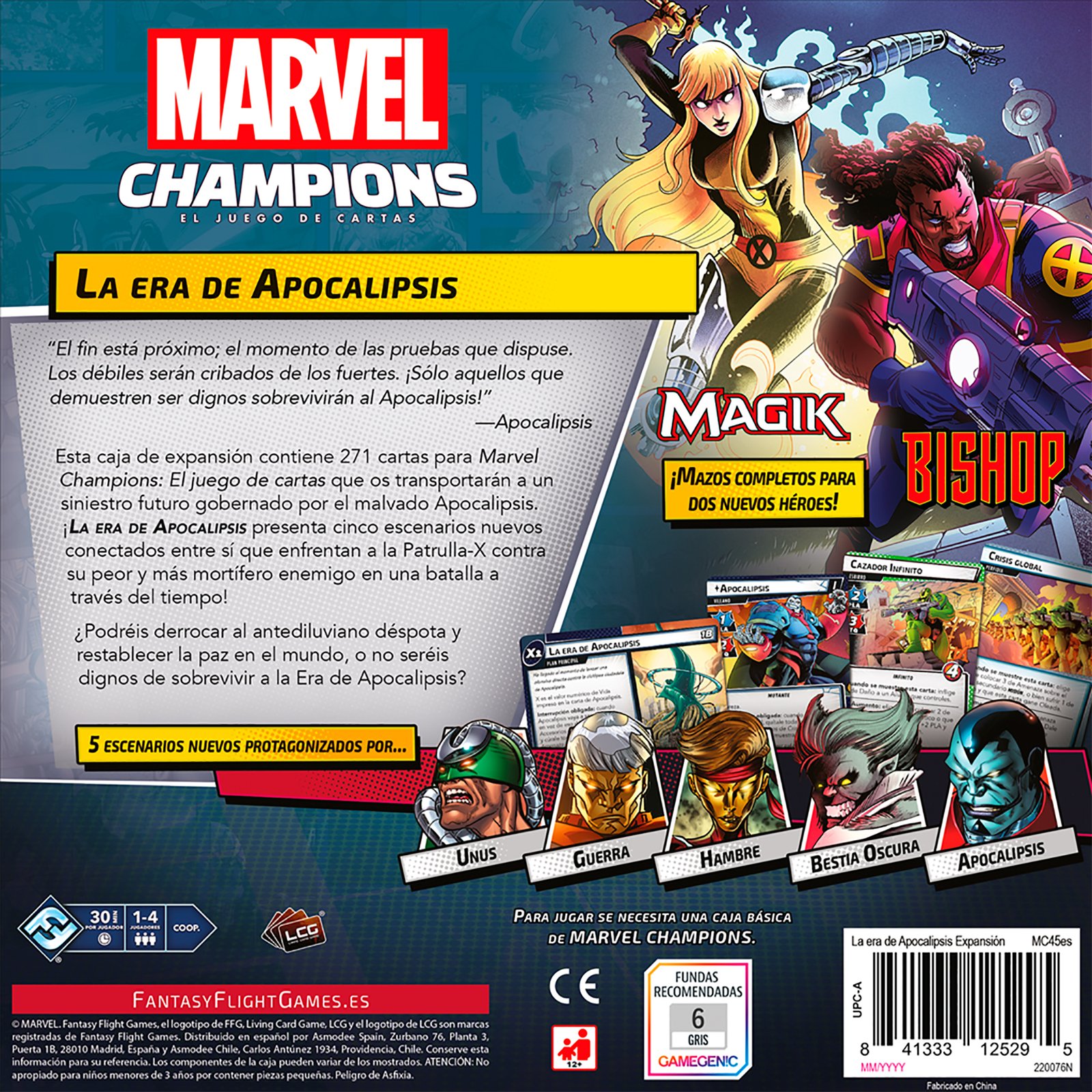 Bienvenidos a la conclusión de la ‘trilogía mutante’ de expansiones para Marvel Champions: El Juego de Cartas! Como séptima expansión de campaña del juego, La Era del Apocalipsis trae varios personajes clásicos de los X-Men, incluyendo dos nuevos héroes jugables, Bishop y Magik, cada uno con un mazo preconstruido listo para jugar desde el principio. Enfréntate a las fuerzas de Apocalipsis, el mayor y más poderoso enemigo de los X-Men. Esta expansión incluye cinco escenarios completamente nuevos, cada uno de los cuales puede jugarse individualmente o como parte de una campaña más amplia.