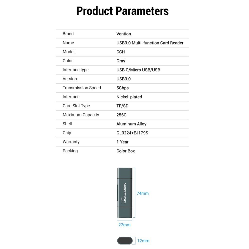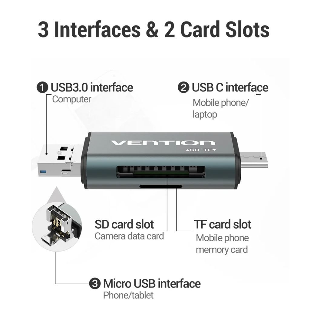Lector de tarjetas SD/TF USB C/USB 3.0/Micro USB Gris CCHH0 Vention