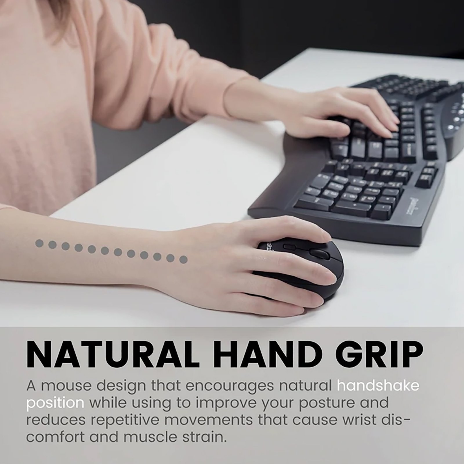 Posición de mano elevada para evitar la tensión del antebrazo y mejorar la postura de la mano, adaptándose a la posición natural de los músculos de la palma y la muñeca mientras se agarra y reduciendo la tensión muscular y las lesiones por esfuerzo repetitivo (RSI).