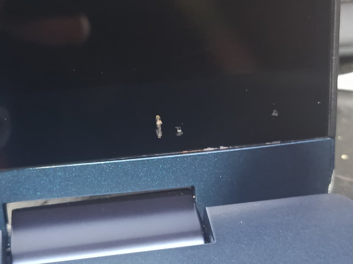 Detalles: El equipo tiene una rotura en el marco de la pantalla a nivel de la bisagra (no afecta imagen) y presenta algunos detalles estéticos.