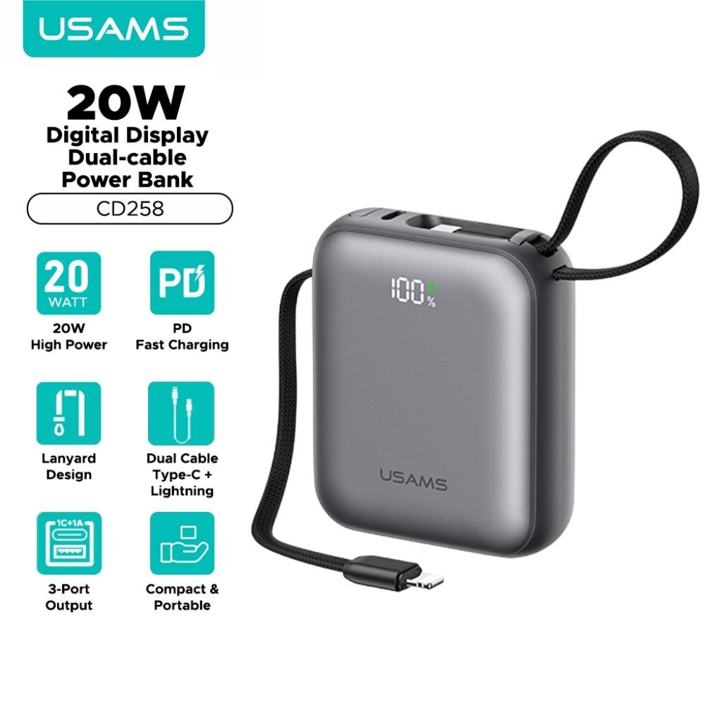 Power Bank 10000mAh 35W c/Cable Tipo C y Lightning Display Digital Gris CD261 - PB86 USAMS