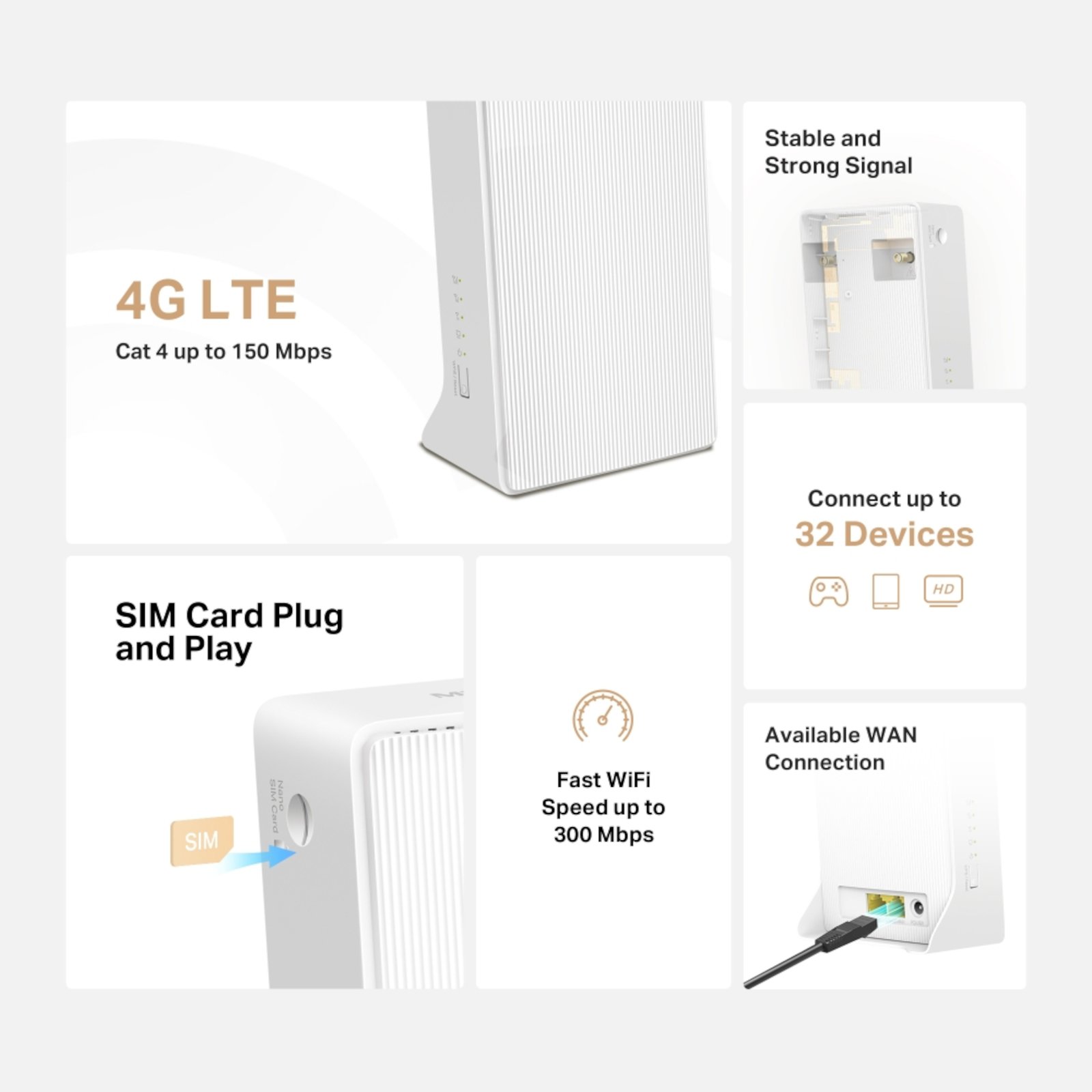 Funcionando como un router 4G, el MB110-4G utiliza la tecnología 4G LTE para alcanzar velocidades superrápidas de hasta 150 Mbps de descarga y 50 Mbps de subida. También puede compartir una red Wi-Fi con una velocidad máxima de 300 Mbps en 2,4 GHz para juegos, Streams y mucho más.